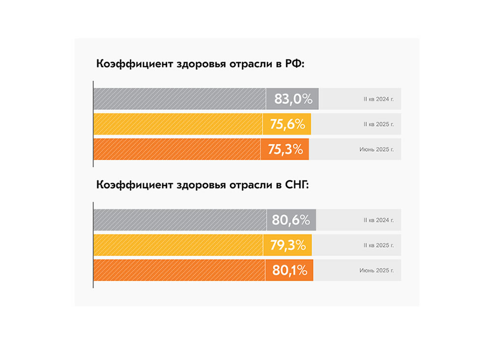 Данные экспертов EVRAZ STEEL свидетельствует о продолжающемся третий квартал подряд снижении активности в отрасли стального строительства. Такие результаты показывает расчёт коэффициента здоровья отрасли (КЗО) за второй квартал 2025 года. Если в четвёртом квартале 2024 года КЗО составлял 80,9%, а в первом квартале 2025 года — 79,1%, то во втором квартале нынешнего года показатель составил уже 75,6%, причём в июне опустился до 75,3%.