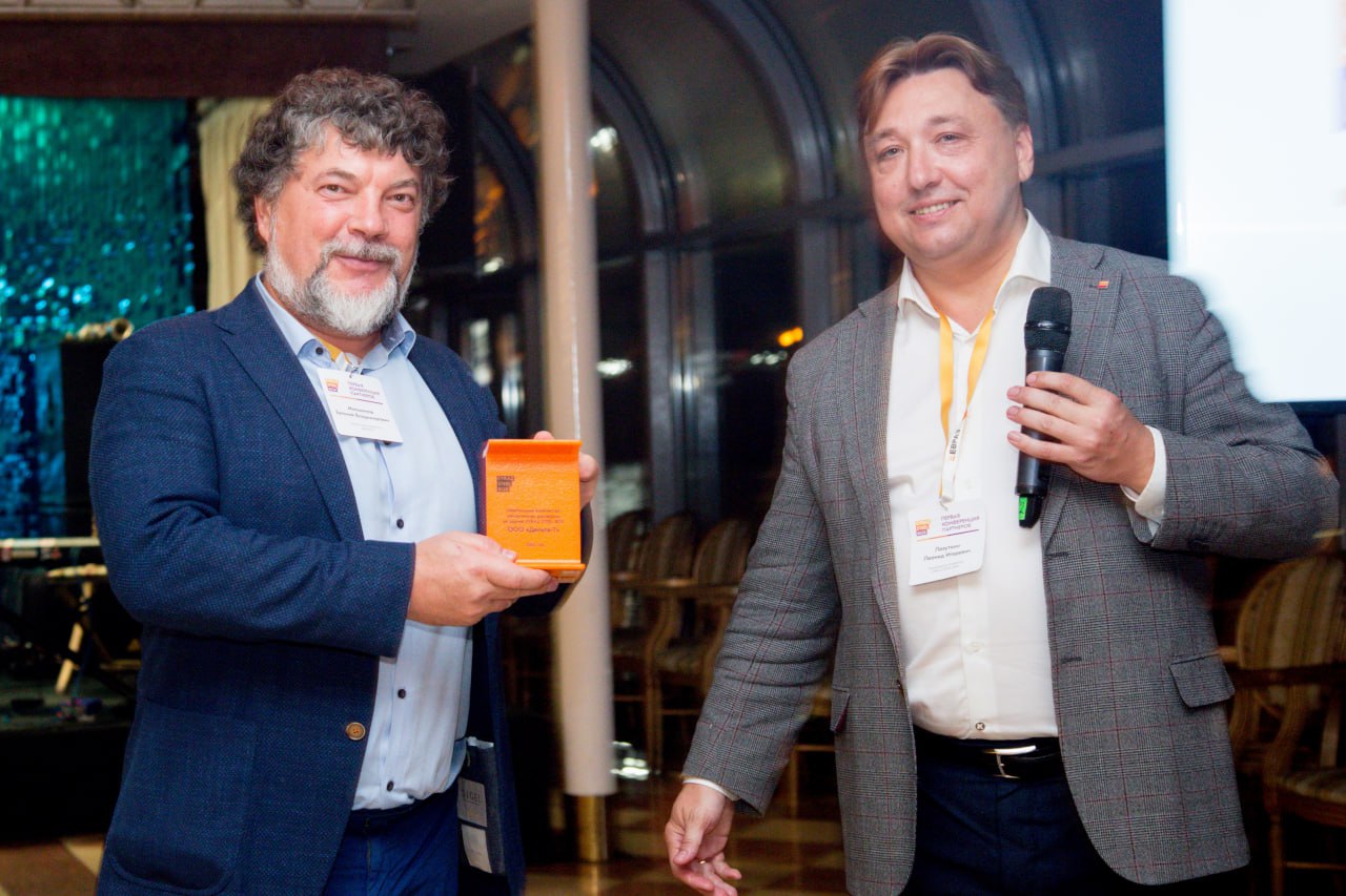 На первой конференции Партнёров EVRAZ STEEL BOX в 2023 году «Дельта-Т» заняла первое место по количеству проданных зданий. Награду Евгению Мельникову вручает генеральный директор компании Леонид Лазуткин. Фото: «Дельта-Т»
