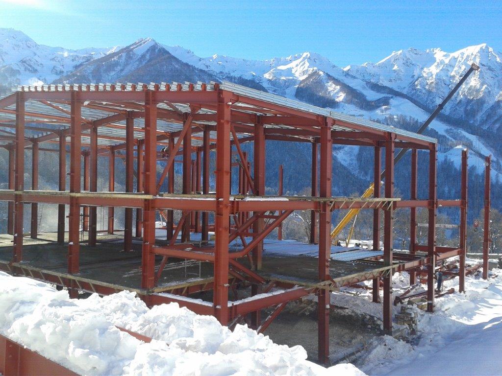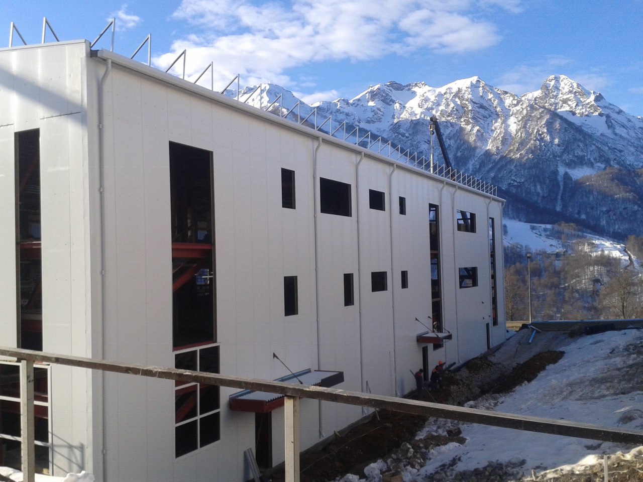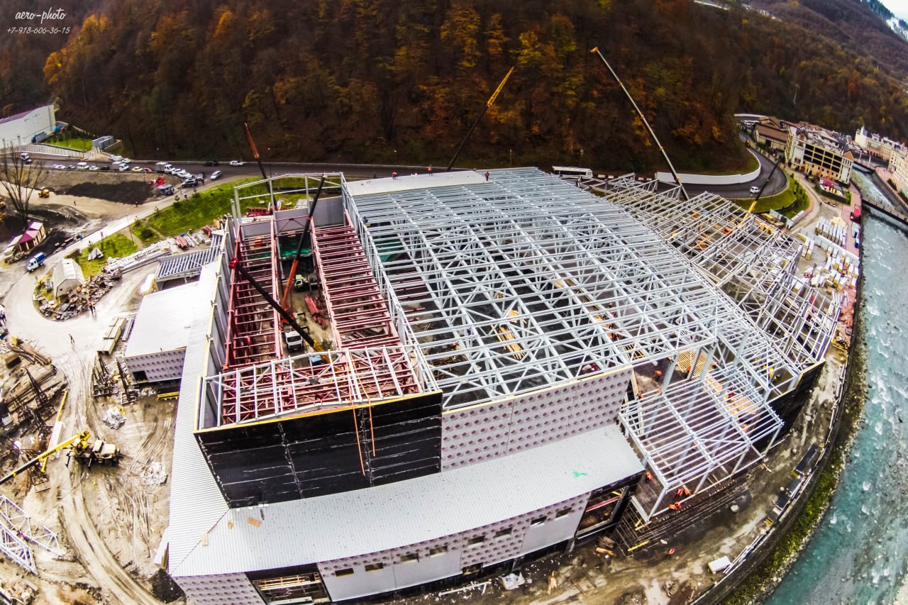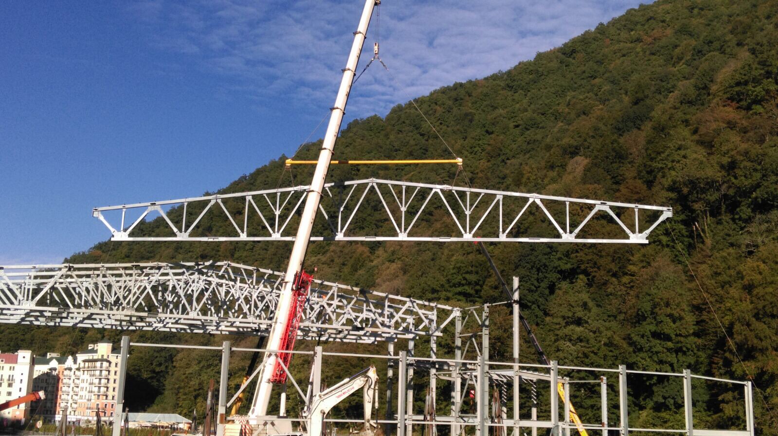 В 2015 году мы построили очередной знаковый объект – здание концертного зала «Роза Холл» в посёлке Эсто-Садок на территории горнолыжного комплекса «Роза Хутор». Были смонтированы ферменные конструкции шириной 54 м (высота фермы в коньке – 5,7 м, вес – 25 т).