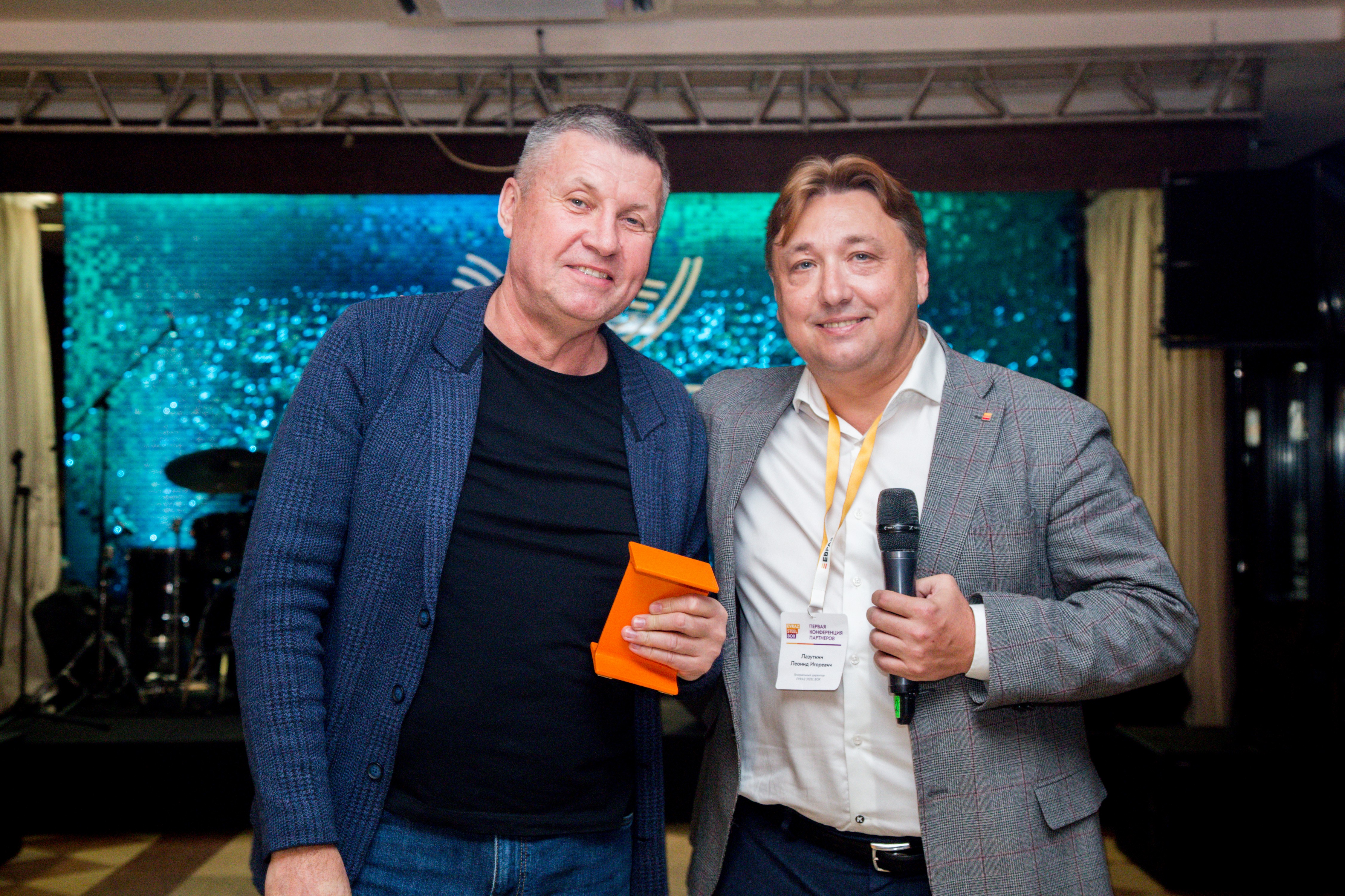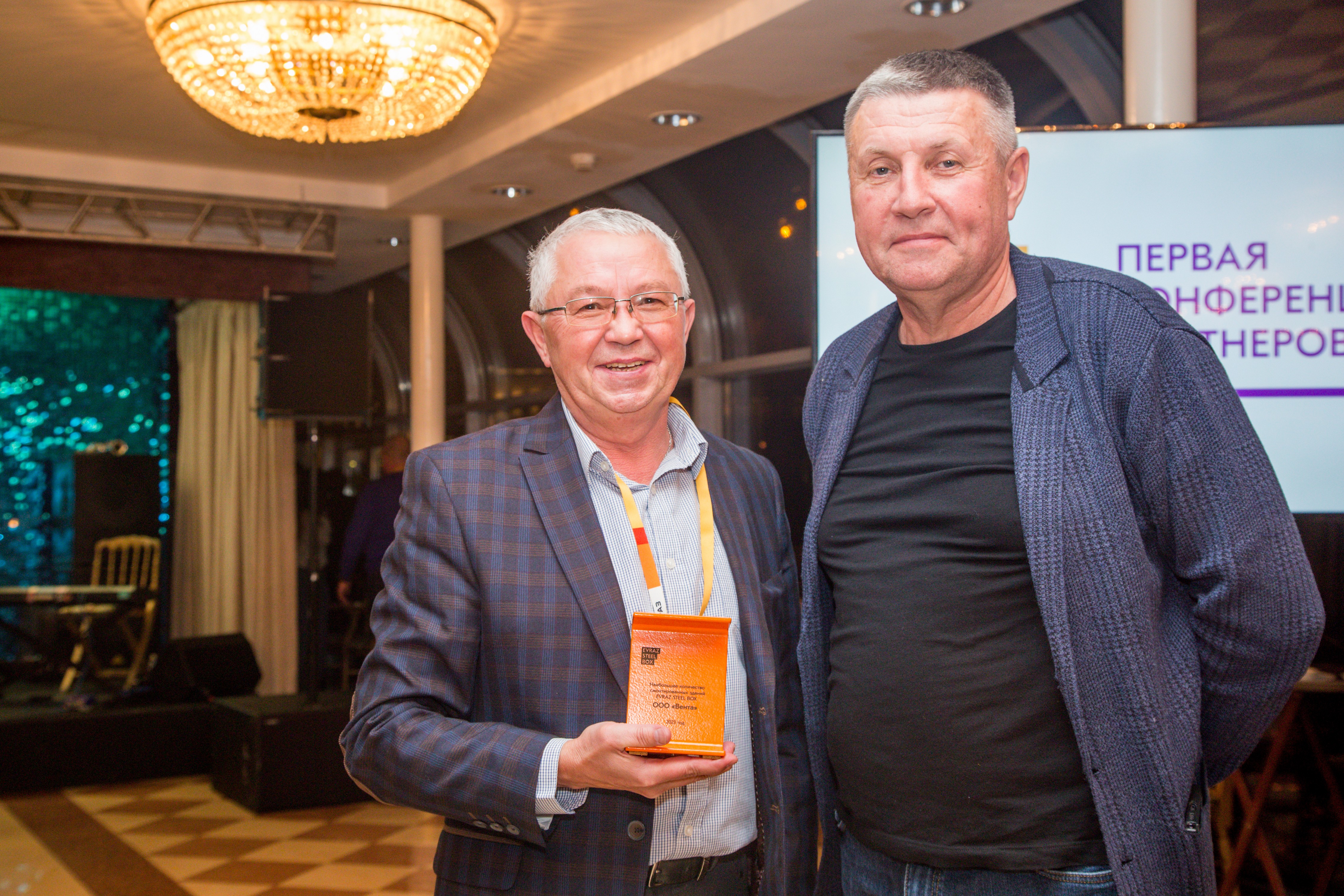 Леонид Лазуткин, генеральный директор EVRAZ STEEL BOX, вручает награду Сергею Маликову, директору ООО «Вента Групп», на первой партнёрской конференции EVRAZ STEEL BOX. Фото: «Вента Групп».