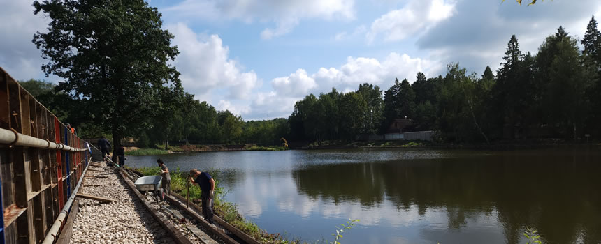 Рабочие монтируют металлокаркас для трибун и готовят свайное поле для деревянного настила по периметру пруда.