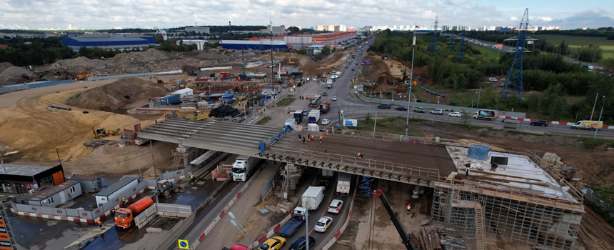Строители начали монтаж металлоконструкций пролётного строения разворотной эстакады между Каширским шоссе и федеральной трассой А-105, подъездной дорогой от Москвы к аэропорту Домодедово. Общая масса металлоконструкций составит порядка 250 т.