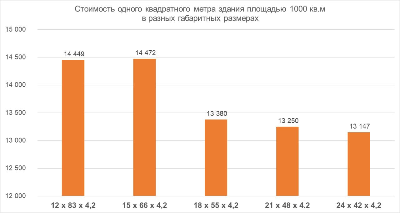 В расчёте традиционно не стали учитывать окна, двери и ворота. В онлайн-конфигуратор BOX EXPRESS заложили пять вариантов габаритов проектируемого здания, в сумме дающих площадь порядка 1000 кв. м – от максимально вытянутой конфигурации до максимально приближенной к квадрату. Усреднённую цену за квадратный метр строительства рассчитывали из стоимости всего комплекта поставки (каркас, стены, кровля). Вот результат: