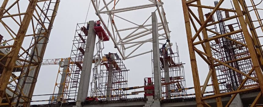Напомним, что из металлоконструкций на высоте 30 м над землёй монтируют кровлю стадиона с вылетом ферм порядка 19 м. Под кровлей из металла делают ходовые мостки для монтажа и обслуживания осветительной и инженерной инфраструктуры.