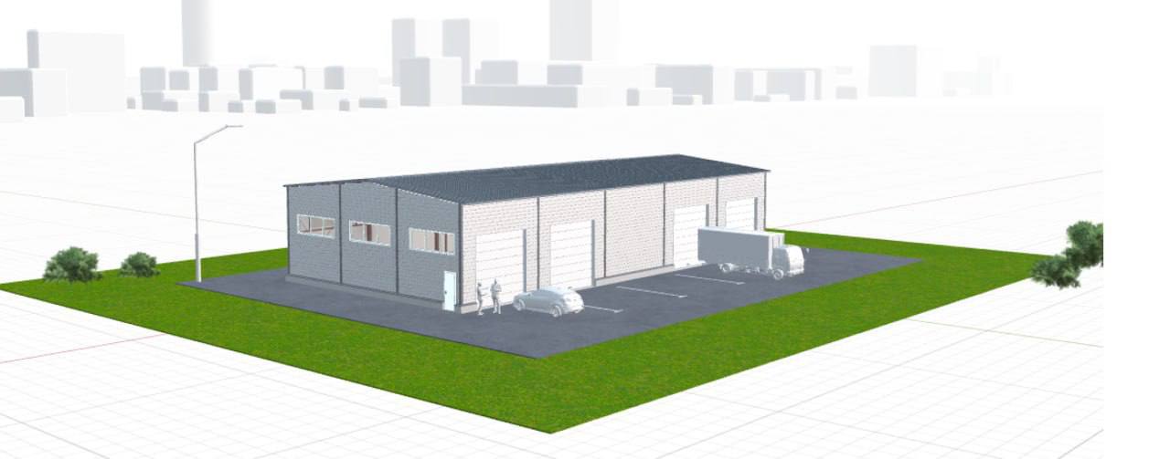 В комплект входят 6 окон, 1 утеплённая металлическая дверь, 4 комплекта подъёмно-секционных ворот с калиткой и ленточное остекление.