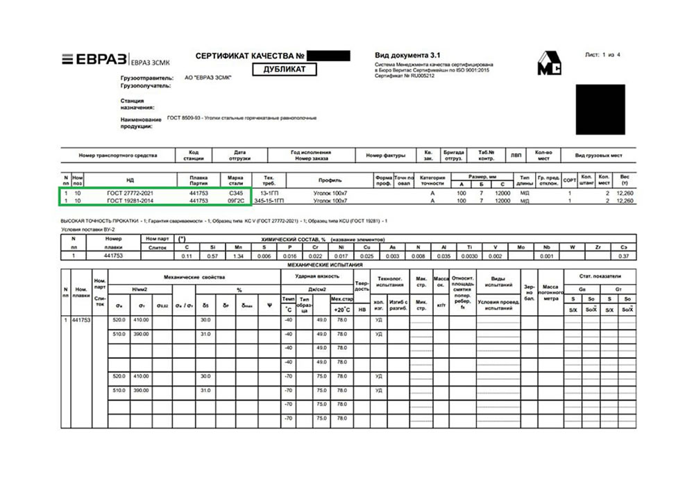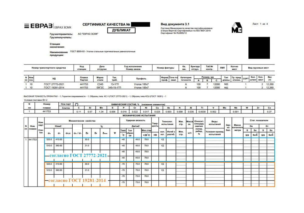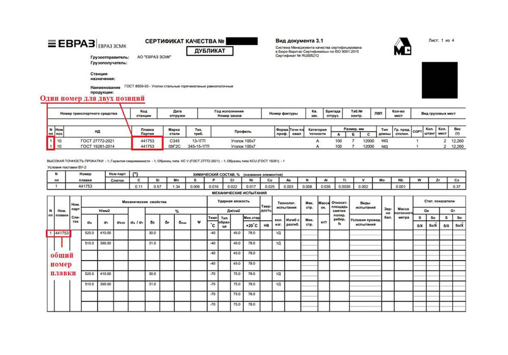 Ответ: В данном документе о качестве по одному и тому же номеру плавки марка стали указана по разным нормативным документам. Это разделение нужно, чтобы отгрузка проката была возможна потребителям с техническими требованиями к материалу по разным ГОСТам.